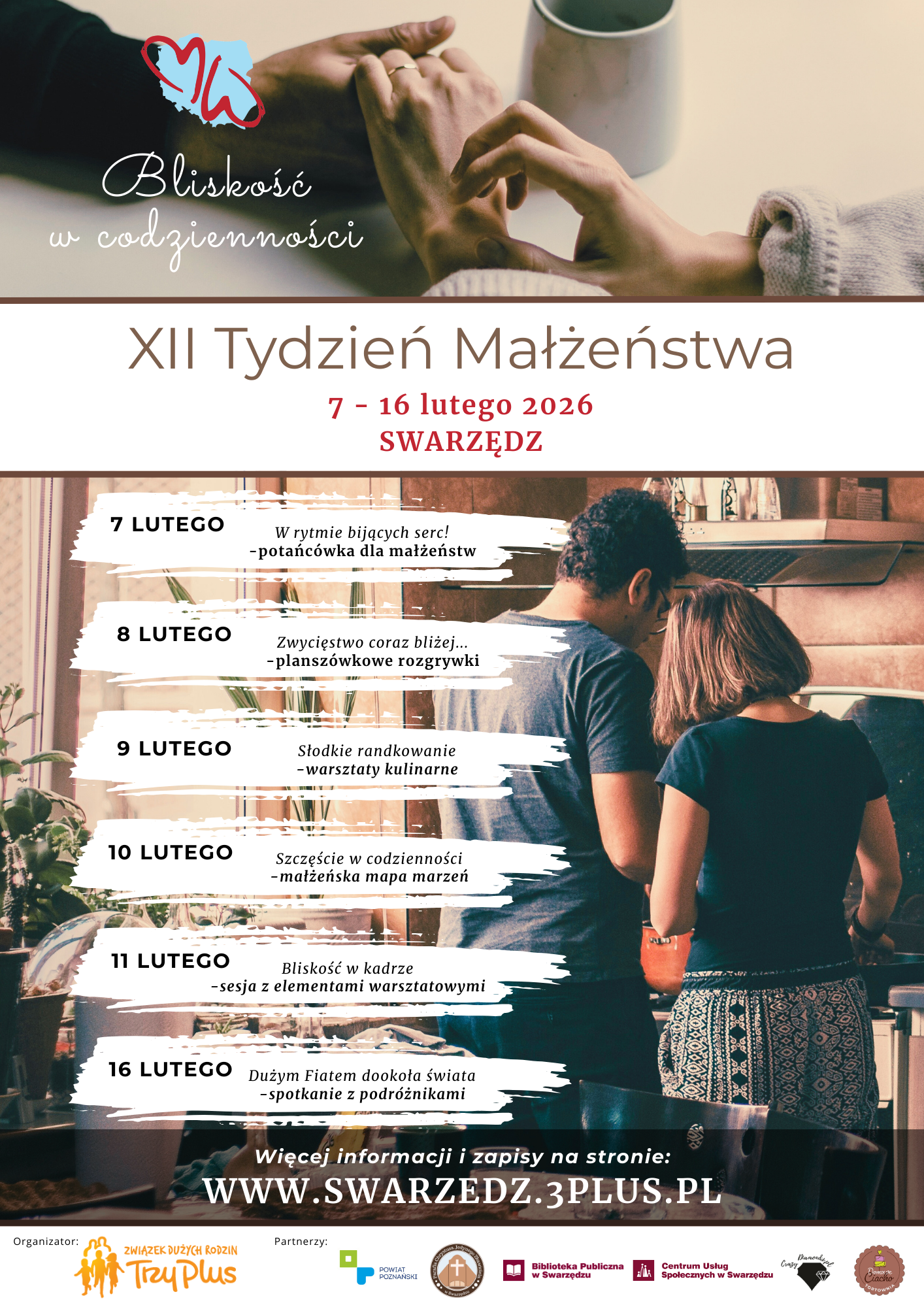 W dniach 7-16 lutego 2026 r. w Swarzędzu odbędzie się XII Międzynarodowy Tydzień Małżeństwa pod hasłem: "Bliskość w codzienności". W programie zaplanowano m.in. potańcówkę dla małżeństw, planszówkowe rozgrywki, warsztaty kulinarne, tworzenie małżeńskiej mapy marzeń, sesję warsztatową z elementami fotografii oraz spotkanie podróżnicze. Wydarzenia mają na celu wzmacnianie relacji, wspólne spędzanie czasu i budowanie bliskości w małżeństwie.